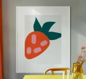 La rappresentazione stilizzata e semplicistica di una fragola presenta un corpo arancione con tre semi rosa e foglie verde scuro. Il design minimalista utilizza colori e forme audaci per evocare un'atmosfera giocosa e moderna.