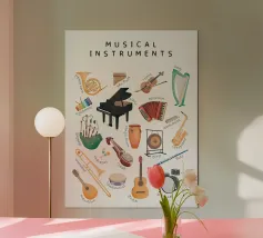 Explore the beauty of string instruments with this detailed educational chart featuring the violin, cello, viola, guitar, harp, and ukulele.