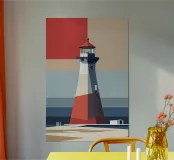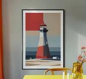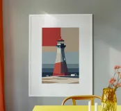 Un'elegante interpretazione del faro di Hörnum, che fonde un'estetica minimalista con audaci elementi architettonici. La torre strutturata in bianco e rosso spicca, mentre lo sfondo si riduce a semplici strati geometrici. Il faro rimane al centro dell'attenzione e trasmette un senso di stabilità e di storia. Quest'opera d'arte offre una prospettiva senza tempo su uno dei punti di riferimento marittimi più significativi di Sylt, ideale per gli amanti del design costiero moderno.