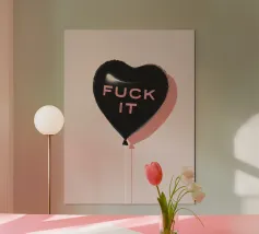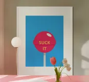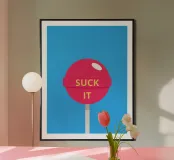 Un lecca-lecca rosa con la scritta "SUCK IT" in lettere gialle. La superficie lucida della caramella aggiunge un tocco giocoso al disegno.