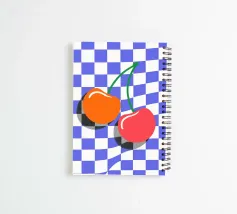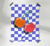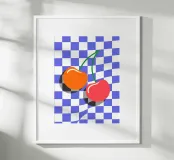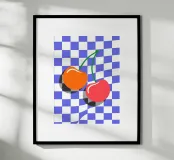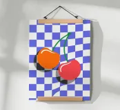 Questa illustrazione minimalista mostra due dolci ciliegie rosse e arancioni su uno sfondo a scacchiera bianca e blu. I colori vivaci e il design semplice porteranno il sapore dell'estate in ogni cucina. Ideale come allegro accento da giardino, questa opera d'arte celebra la bellezza e la freschezza della natura.