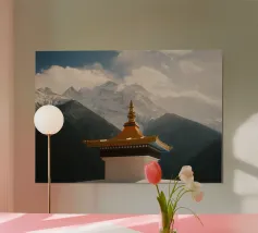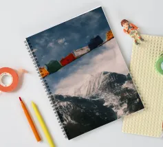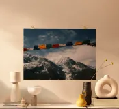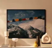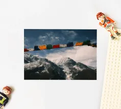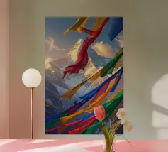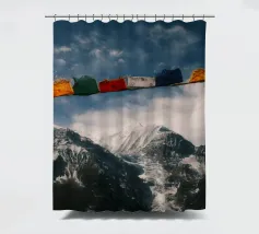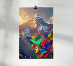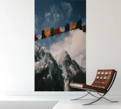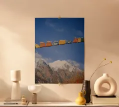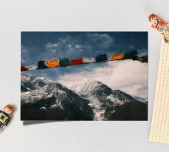 Un momento emozionante sul Circuito dell'Annapurna: le colorate bandiere di preghiera tibetane sventolano al vento in primo piano, mentre le cime innevate dell'Himalaya si ergono sotto un cielo drammatico sullo sfondo. Ogni bandiera reca preghiere che devono essere diffuse dal vento, offrendo un contrasto spirituale con il crudo e maestoso paesaggio montano del Nepal.