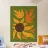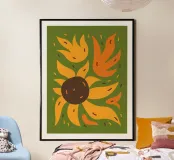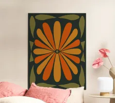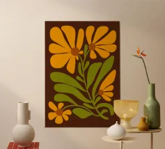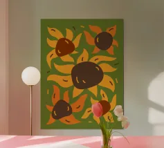 Forme astratte di colore giallo e arancione brillante che ricordano un girasole. Forme curve e piccole linee aggiungono un senso dinamico di movimento alla composizione.