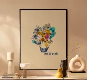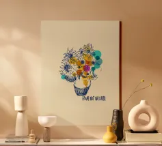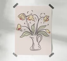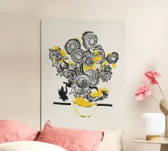 Illuminate qualsiasi spazio con questa espressiva illustrazione di bouquet di girasoli. Il disegno a inchiostro libero prende vita con sovrapposizioni di giallo caldo, verde acqua e magenta, fondendo il fascino floreale classico con l'arte moderna astratta. Ideale per cucine, studi o pareti di gallerie.