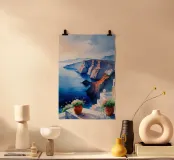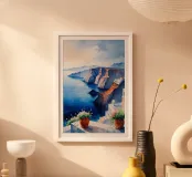 Questo sereno acquerello mette in risalto la bellezza mozzafiato della caldera di Santorini, con le sue scogliere illuminate dal sole e le acque blu intenso. La semplicità dell'architettura cicladica, accentuata da vasi di terracotta e piante fiorite, contribuisce a creare un'atmosfera tranquilla. L'equilibrio armonioso di luce, struttura e colore cattura l'essenza dell'isola greca, offrendo una fuga visiva nella tranquillità e nel fascino.