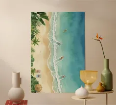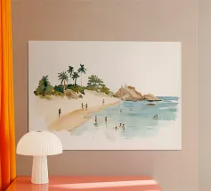 Poster decorativo "Sunny Beach" di Isabelle Vandeplassche, illustrazione acquerello di una spiaggia soleggiata con mare calmo. Stampa su carta di alta qualità, ideale per decorare soggiorni, camere da letto o uffici con un tocco rilassante e naturale. Perfetto come regalo per amanti del mare e della natura.