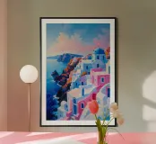 Questo squisito dipinto cattura l'alba sulle cupole blu a cascata e sugli edifici imbiancati di Oia, a Santorini. La tecnica impressionista mette in risalto i caldi toni pastello del cielo dell'alba, armonizzandoli con i blu freddi del mare e dell'architettura. Le scogliere frastagliate e le acque tranquille esaltano l'accattivante bellezza dell'isola, creando un'opera d'arte che celebra la serenità e il fascino vibrante della destinazione più iconica della Grecia. Questo capolavoro è un omaggio all'eleganza senza tempo e all'ispirazione artistica di Santorini.