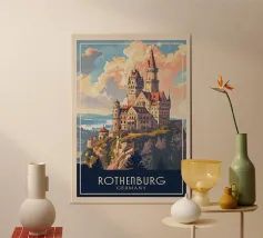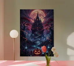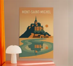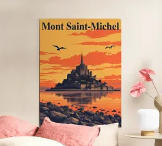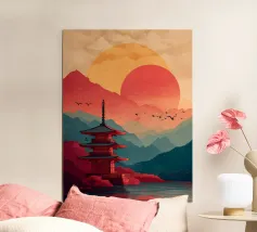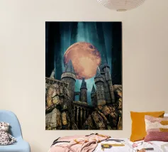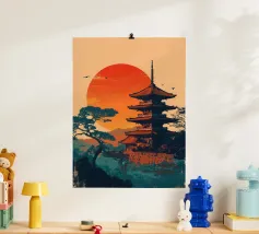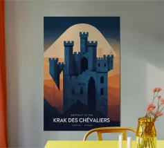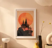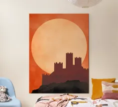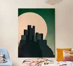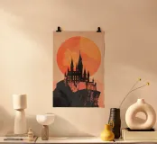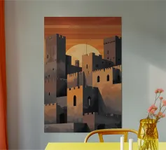 La maestosa silhouette di un castello medievale si erge dal bordo di una scogliera rocciosa, sullo sfondo di un sole arancione incandescente. L'audace contrasto tra l'architettura scura e il cielo sognante del tramonto evoca un senso di leggende dimenticate e regni antichi. Le texture minimaliste e le ombre a blocchi conferiscono all'opera un'estetica vintage moderna, perfetta per i sognatori, gli amanti del fantasy e coloro che sono attratti dal mistero e dalla grandezza.