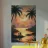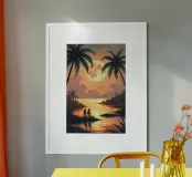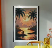 Una splendida rappresentazione di un tramonto tropicale in cui la luna e le nuvole dipingono il cielo di sfumature dorate. Due donne siedono pacificamente in riva al mare, abbracciate dal caldo bagliore che si riflette sulla tranquilla laguna. Le palme svettanti ondeggiano dolcemente nella brezza, incorniciando la pittoresca composizione. Il gioco di luci e ombre esalta la qualità onirica della scena, mentre i blu profondi e gli arancioni tenui creano un contrasto sorprendente. Quest'opera d'arte racchiude la bellezza della natura incontaminata, invitando lo spettatore a entrare in un mondo sereno dove il tempo rallenta e la mente si abbandona a un beato relax.