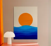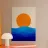 Un grande sole arancione tramonta o sorge sopra una serie di strati blu ondulati che rappresentano l'oceano. Lo sfondo è di colore beige chiaro e crea una scena tranquilla e minimalista.