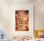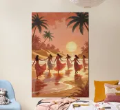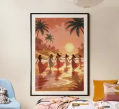 Un gruppo di sei donne danza a piedi nudi lungo la riva del mare, muovendosi ritmicamente con il suono delle onde. Vestite con gonne fluenti, i loro movimenti riecheggiano un legame rituale con la natura. Il sole al tramonto dipinge il cielo di calde tonalità arancioni e rosa, riflettendo il suo bagliore sulla sabbia bagnata. Le palme svettanti ondeggiano dolcemente sullo sfondo, aggiungendo una qualità onirica alla scena. L'immagine cattura il perfetto connubio tra movimento, natura e luce, creando una potente immagine di unità e serenità in riva al mare.