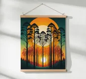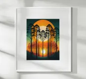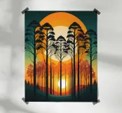 Sunset SereA captivating digital art depicting a serene forest at sunset. The tall, silhouetted trees stand tall against a vibrant backdrop of orange and yellow hues, creating a breathtaking scene. The setting sun casts long shadows, adding depth and dimension to the composition. This artwork evokes feelings of tranquility and peace, making it a perfect addition to any modern home.nade