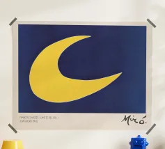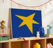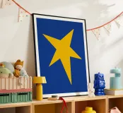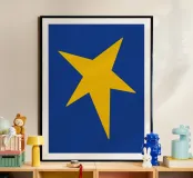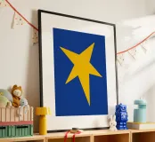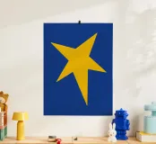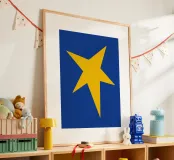 Un'audace stella gialla brilla su uno sfondo blu intenso in questo sorprendente design minimalista. Perfetta per le gallerie da parete e per l'arredamento eclettico della casa, questa opera d'arte aggiunge un tocco giocoso e moderno con un pizzico di fascino retrò.