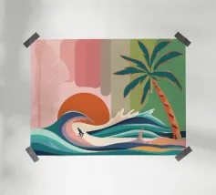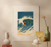 L'immagine mostra una persona che cavalca un'onda impressionante con una posizione potente su una tavola da surf rossa. L'onda è dinamica e vivace, con le bianche scogliere che enfatizzano il movimento. La tavolozza dei colori comprende blu intensi con accenni di verde, che rendono la scena particolarmente energica. Lo stile è illustrativo e pittorico, con una texture ornata che aggiunge profondità all'immagine. Cattura l'eccitazione e la libertà del surf in modo estetico. Un momento reale pieno di dinamismo!