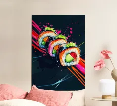 Porta un tocco di originalità nella tua cucina con questa stampa artistica di sushi, perfetta per appassionati di cucina giapponese e amanti del cibo. Realizzata su carta di alta qualità e incorniciata con legno resistente, questa opera d'arte è ideale per decorare la tua cucina o sala da pranzo.