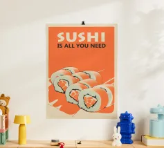 Questo poster presenta un design grafico retrò massimalista in viola e arancione. Su uno sfondo beige chiaro, la parola Sushi scorre verso il basso con una tipografia in grassetto, e c'è anche una foto ritoccata di un paio di Sushi al salmone. In giapponese si legge "bon appétit" e "délicieux! Il design ricorda un manifesto pubblicitario di un ristorante ed è quindi una decorazione ideale per la vostra cucina.