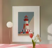 Questa opera d'arte modernista presenta il faro di Hörnum come una struttura audace e dinamica, che enfatizza gli angoli acuti e le forme astratte. In equilibrio tra realismo e astrazione, il faro è semplificato in suggestive bande rosse e bianche, sullo sfondo di un cielo blu intenso e di una sabbia strutturata. Il gioco di campi di colore e ombre della composizione crea un senso di profondità, rendendolo un tributo contemporaneo al patrimonio marittimo e alla bellezza costiera di Sylt.