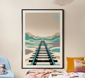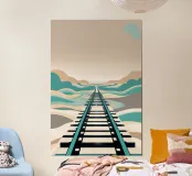 Questa rappresentazione artistica cattura l'iconica linea ferroviaria di Sylt con un approccio minimalista e astratto. La ferrovia si estende all'infinito verso l'orizzonte, fondendosi perfettamente con le morbide dune e le sfumature oceaniche. L'opera enfatizza la transizione senza soluzione di continuità tra le strutture costruite dall'uomo e il paesaggio costiero circostante. I toni tenui del beige, del verde acqua e del marrone sabbioso conferiscono all'immagine una qualità onirica, riecheggiando l'essenza tranquilla e potente del Mare del Nord. La composizione attira lo sguardo lungo i binari, evocando un senso di nostalgia, solitudine e la promessa di un viaggio senza fine.