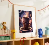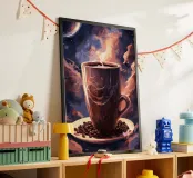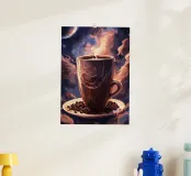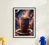 caffè tazza di caffè vapore spazio luna pianeti chicchi di caffè piattino nuvole cielo notturno celeste cosmo galassia stelle tramonto colori caldi spazio esterno aroma mattina bevanda