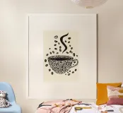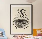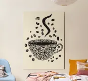 Questa opera d'arte minimalista raffigura una tazza di caffè fumante composta interamente da piccoli chicchi di caffè stilizzati. I chicchi galleggianti e il vapore elegantemente curvo aggiungono leggerezza e movimento al motivo, mentre il semplice design nero su beige crea un look moderno e senza tempo. Perfetto per le caffetterie, le cucine o gli amanti del caffè che desiderano un'illustrazione elegante e discreta che sottolinei l'amore per la loro bevanda preferita. Questo motivo è ideale per gli stili di interni minimalisti e moderni.