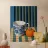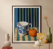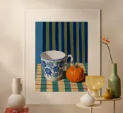 Una natura morta semplice ed elegante con una tazza a fantasia bianca e blu accanto a una piccola zucca arancione. La scena si svolge su uno sfondo a strisce bianche e blu, creando una composizione pulita, grafica e autunnale.