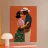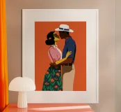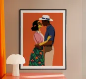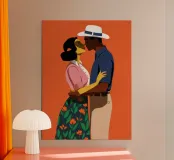 Un'illustrazione tenera e romantica di un uomo e una donna abbracciati, con la mano di lui delicatamente sulla schiena di lei, stagliata su uno sfondo caldo color tramonto.