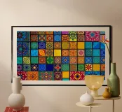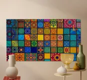 Le tessere dai colori vivaci presentano una serie di motivi intricati in varie tonalità, creando un mosaico straordinario. L'opera d'arte presenta disegni floreali e geometrici in una composizione vivace.