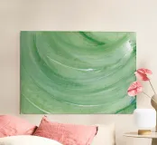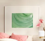 Minima pennellata astratta di colore acrilico verde con striature di bianco che attraversano la carta in un'onda audace.