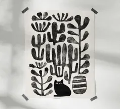 Un mistico gatto nero siede sotto una luna crescente, circondato da motivi vorticosi e trame intricate. L'opera d'arte in stile linoleografico evoca un'aria di mistero e magia, fondendo la natura e la notte in una composizione accattivante.
