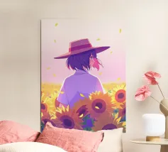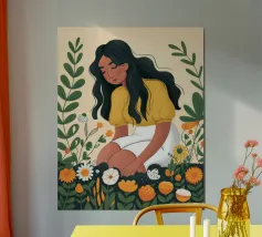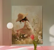 Un piccolo giardiniere è inginocchiato nel prato e innaffia le margherite con cura e tranquillità. La luce del sole filtra attraverso l'erba alta, catturando la bellezza della quiete e della curiosità infantile: un pezzo perfetto per ogni stanza da sogno.