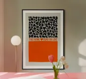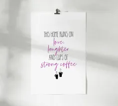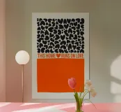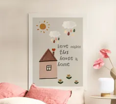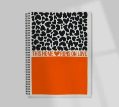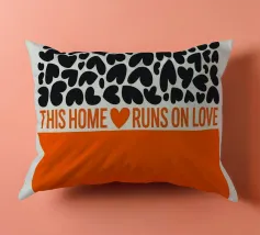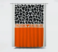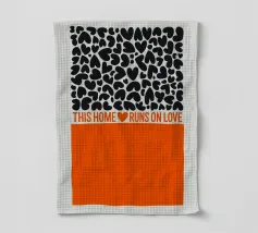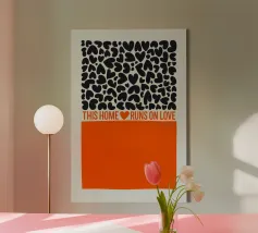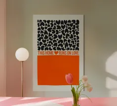 Una dichiarazione di stile in nero e arancione: tanti cuori e il chiaro messaggio "Questa casa funziona con l'amore" rendono questo disegno un amorevole richiamo per ogni casa.