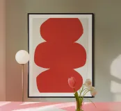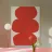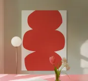 Three bold red irregular oval shapes are stacked vertically. The composition creates a striking and minimalist visual effect.