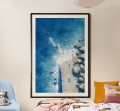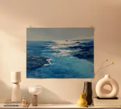 Questa opera d'arte cattura un drammatico momento aereo in cui le potenti acque blu si scontrano con uno stretto sentiero costiero scavato nella roccia. Le texture spesse ed espressive trasmettono l'energia del mare, mentre gli schizzi di schiuma bianca creano un contrasto sorprendente con il blu profondo. Le piccole figure umane che camminano lungo il bordo sottolineano la scala e la vulnerabilità, trasformando la scena in una tranquilla meditazione sull'equilibrio tra movimento e immobilità. Mescolando astrazione e realismo, la composizione evoca la contemplazione, la resilienza e l'attrazione senza tempo della costa, ideale per gli interni moderni e per le finiture di grande formato.