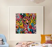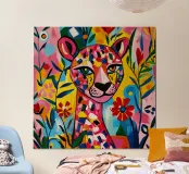 Questo vivace dipinto presenta una tigre in un audace stile cubista, ispirato a Picasso. Il volto e il corpo della tigre sono astrattamente frammentati in forme geometriche colorate, creando una composizione dinamica e moderna. Indossa occhiali da sole rosa oversize e tiene tra le zampe un grande cuore a motivi floreali. Lo sfondo è costituito da pennellate pastello espressive in rosa, turchese e giallo, che aggiungono una qualità onirica. La fusione di cubismo, colori vivaci ed elementi floreali rende quest'opera d'arte una rappresentazione sorprendente e giocosa dell'amore e della bellezza selvaggia.