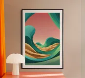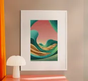 Le sabbie dorate incontrano onde verdi e vibranti in questa moderna interpretazione artistica del deserto siriano. Il design minimalista accentua i motivi organici e fluidi delle dune, mentre il cielo rosa e arancione pastello crea uno sfondo morbido e sereno. Questa opera d'arte astratta racchiude la tranquillità e la grazia dei paesaggi desertici della Siria, offrendo un'interpretazione unica e pacifica della bellezza incontaminata della natura.