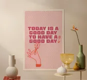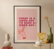 Stampa d'arte ispirata con la frase "Oggi è un buon giorno per avere una buona giornata" in grassetto tipografico in stile retrò. Il disegno è su uno sfondo rosa e crema con un'illustrazione minimalista di una mano che tiene un piccolo fiore. La combinazione di testo edificante e colori allegri rende questa stampa perfetta per illuminare qualsiasi ambiente e aggiungere positività e motivazione all'arredamento della casa o dell'ufficio.