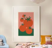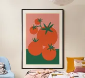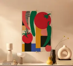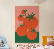 Un poster pop art minimalista mostra pomodori rossi brillanti con foglie verdi vibranti su uno sfondo rosa. Le forme piatte e i contrasti netti appaiono giocosi e allo stesso tempo quasi da manifesto politico, come se il pomodoro stesso venisse dichiarato simbolo di una piccola rivoluzione.