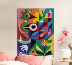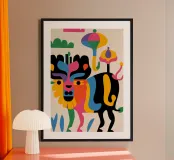 Raffigurazione astratta di un toro dal corpo colorato e geometrico. Lo sfondo comprende varie forme e motivi astratti.