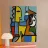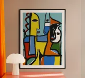 Two stylized figures dominate the composition, featuring abstracted shapes and bold colors. One figure appears in profile while the other faces forward, both with exaggerated features and a whimsical quality.