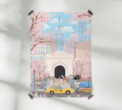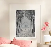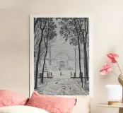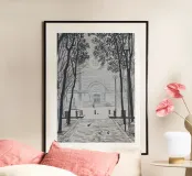 Stampa di un disegno originale di Plaça de la Virreina nel quartiere Gràcia di Barcellona. Una piacevole passeggiata, adatta alle persone e non alle auto, conduce a questa piazza da altre piazze vicine, come Plaça del Diamant e Plaça de Rovira i Trias. Avvicinandosi al Cinema Verdi, si scorge la facciata di una delle chiese più antiche di Barcellona, famosa per la sua cappella costruita da Francesc Berenguer, allievo di Antoni Gaudí.