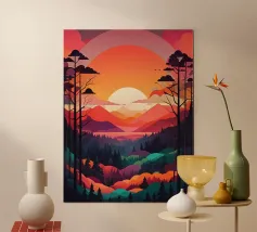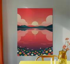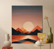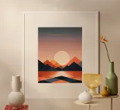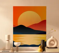 Un dipinto di paesaggio minimalista e geometrico che raffigura un sereno tramonto su un lago tranquillo. La scena è caratterizzata da montagne torreggianti nei toni dell'arancione e del blu, da un grande sole luminoso e da un tranquillo riflesso del cielo sull'acqua. Le linee pulite e i colori vivaci dell'opera creano un senso di pace e tranquillità.