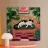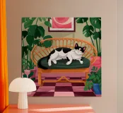 Quest'opera d'arte raffigura un gatto bianco e nero che riposa su una panchina di vimini circondata da fogliame verde. Lo sfondo rosa tenue esalta la composizione pacifica.