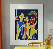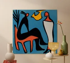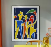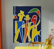 Linee decise e colori vivaci formano rappresentazioni astratte di figure su uno sfondo blu scuro. Forme che ricordano volti e corpi umani si mescolano a forme geometriche, suggerendo una composizione vivace e stravagante.