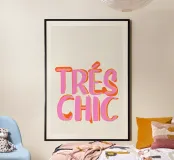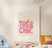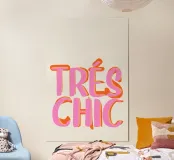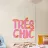 Questa immagine presenta un design tipografico audace e giocoso con la frase "TRÈS CHIC" in evidenza. Il testo è scritto in un carattere maiuscolo stilizzato, con ogni lettera riempita di un rosa brillante. Le lettere hanno un effetto ombra arancione, che aggiunge profondità al testo e lo fa risaltare sullo sfondo bianco sporco. Il design complessivo è semplice ma accattivante e combina colori vivaci con un'espressione alla moda e di tendenza.