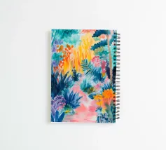 Un paesaggio vibrante e ricco di colori, con una vegetazione lussureggiante nelle tonalità del blu, del rosa, dell'arancio e del giallo. La scena suggerisce un ambiente tropicale stravagante sotto un cielo caldo e luminoso.