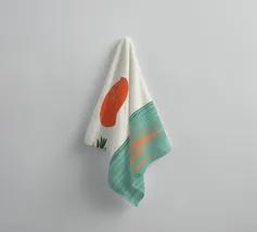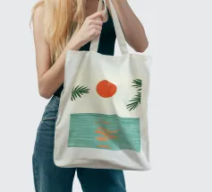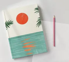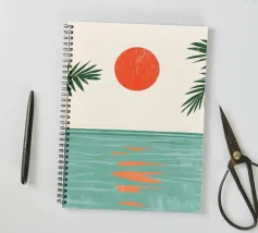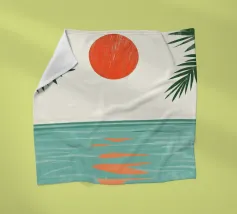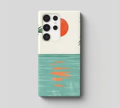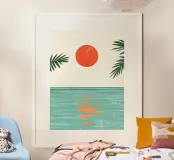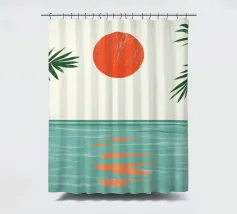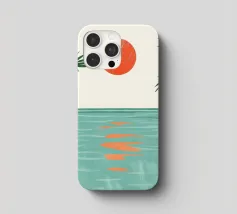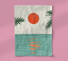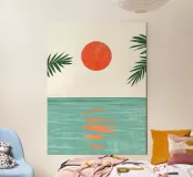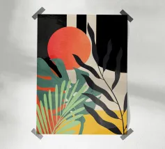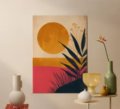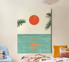 Quest'opera d'arte mostra un caldo sole arancione che si riflette su una calma acqua turchese, incorniciata da morbide foglie di palma verdi. Le forme semplici e le superfici strutturate creano un'atmosfera rilassata e tropicale, facile da capire e piacevole da guardare. Un design moderno che porta calore, calma e un'atmosfera vacanziera in qualsiasi interno.