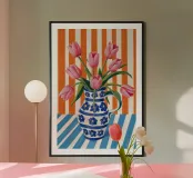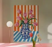 Una vivace natura morta di un bouquet di tulipani rosa in un audace vaso a righe bianche e blu. La composizione è fresca, grafica e piena di energia primaverile.