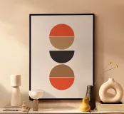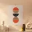 Due serie di semicerchi sono impilati verticalmente, ciascuno con colori contrastanti come l'arancione, il beige e il nero, creando motivi geometrici. La simmetria e il contrasto cromatico evocano un senso di equilibrio e di design moderno.