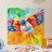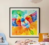 Un uccello vivace con un mix di piume blu, rosse e gialle si libra nell'aria, circondato da una serie di motivi astratti colorati e tonalità tenui.