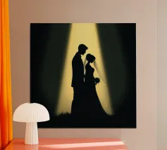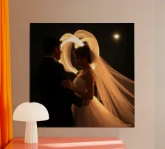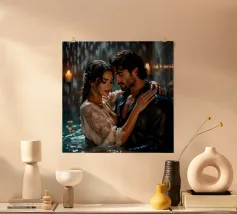 Coppia sensuale abbracciata in una luce dorata Questa immagine cattura una coppia in una danza tenera e intima, circondata da un'illuminazione calda e dorata e da colori tenui, che evocano le atmosfere lunatiche dei classici film noir e i ritratti psicologici e ricchi di sfumature di Lucian Freud.